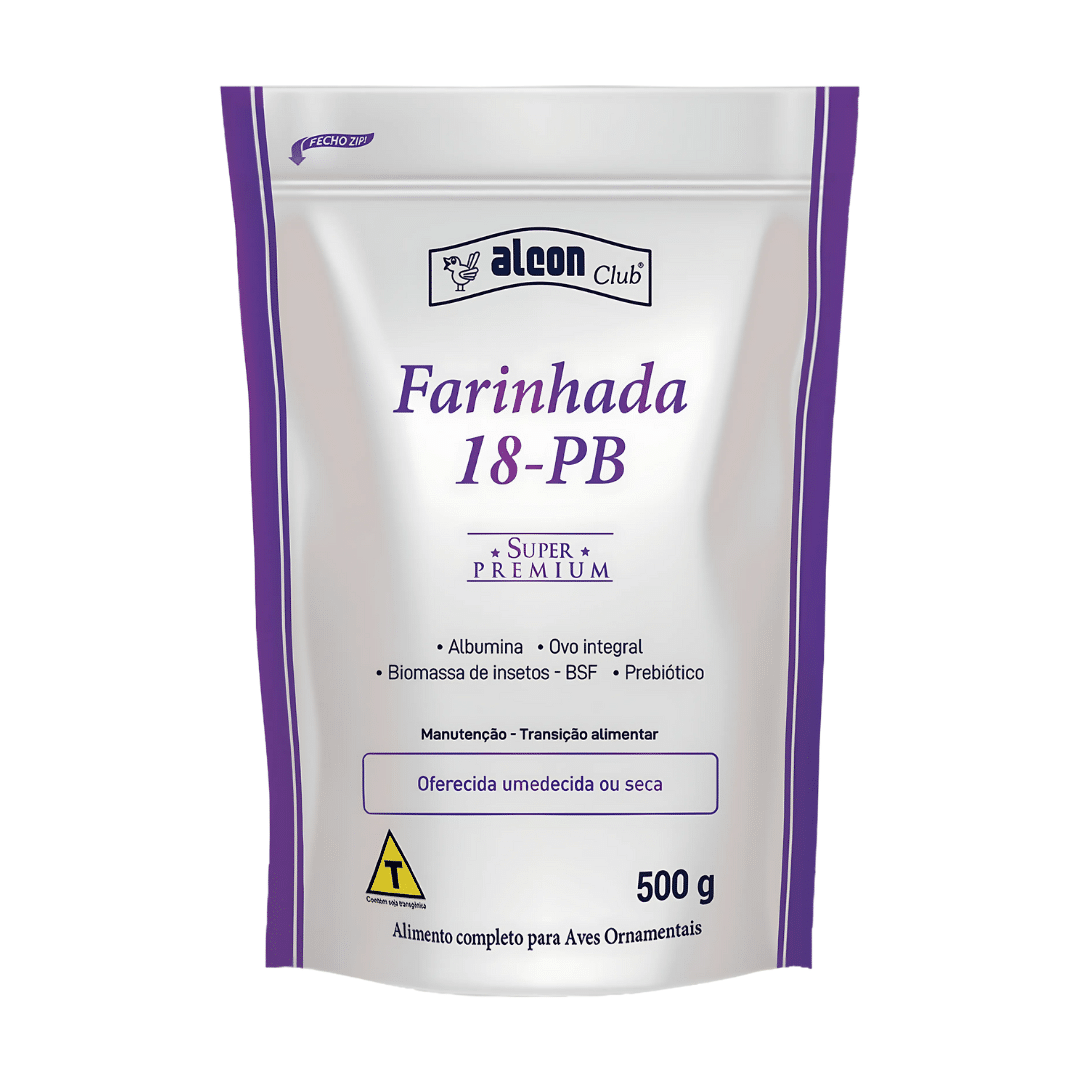 Alcon Club Farinhada 18-PB é um alimento completo Super Premium, cientificamente elaborado para suprir as necessidades nutricionais e energéticas de aves adultas durante a fase de manutenção ou como complemento da dieta em períodos especiais. Suas características particulares de textura, granulometria e maciez são ideais para os períodos de muda de bico e muda de penas. Muito recomendado para realizar transições alimentares em aves que têm dificuldade em aceitar o alimento extrusado. Sua composição criteriosamente balanceada, livre de corantes artificiais e palatabilizantes, possui albumina, ovo integral e biomassa de insetos – BSF (Black Soldier Fly), uma fonte de proteína sustentável de alta biodisponibilidade, rica em ácidos graxos e aminoácidos. Apresenta alta digestibilidade e palatabilidade, além de ser um alimento muito atrativo às aves.
