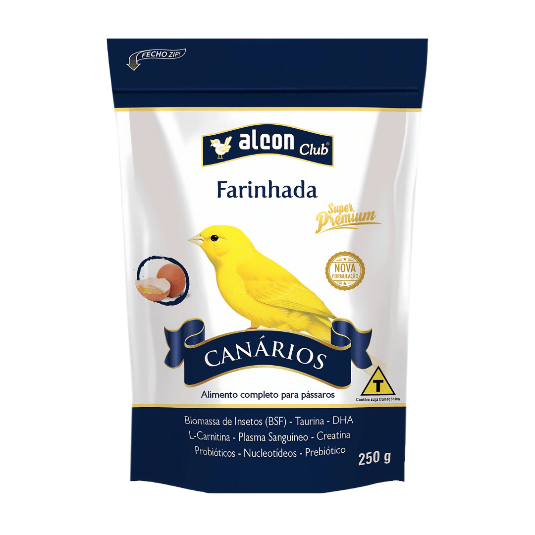 Alcon Club Farinhada Canários Super Premium é um alimento completo especialmente formulado para a alimentação de Canários Belga e Canários da Terra, Mandarins, Manons, Calafates, Diamantes de Gould e outros pássaros granívoros em períodos de maior necessidade nutricional, como na época de reprodução e de muda de penas. É enriquecido com Vitamina E, além de fontes de Selênio Orgânico e DHA (precursor de Ômega 3), ingredientes importantes para o período reprodutivo. Apresenta nucleotídeos, Prebiótico e Probióticos, que favorecem o desenvolvimento da flora intestinal benéfica, melhorando o aproveitamento dos nutrientes. Possui ovo integral e biomassa de insetos – BSF (Black Soldier Fly), uma fonte de proteína sustentável de alta biodisponibilidade, além de plasma sanguíneo, fonte de imunoglobulinas de alto valor biológico. A presença de Creatina, L-Carnitina e Taurina garante eficiência no metabolismo energético e suporte aos sistemas vitais das aves.
