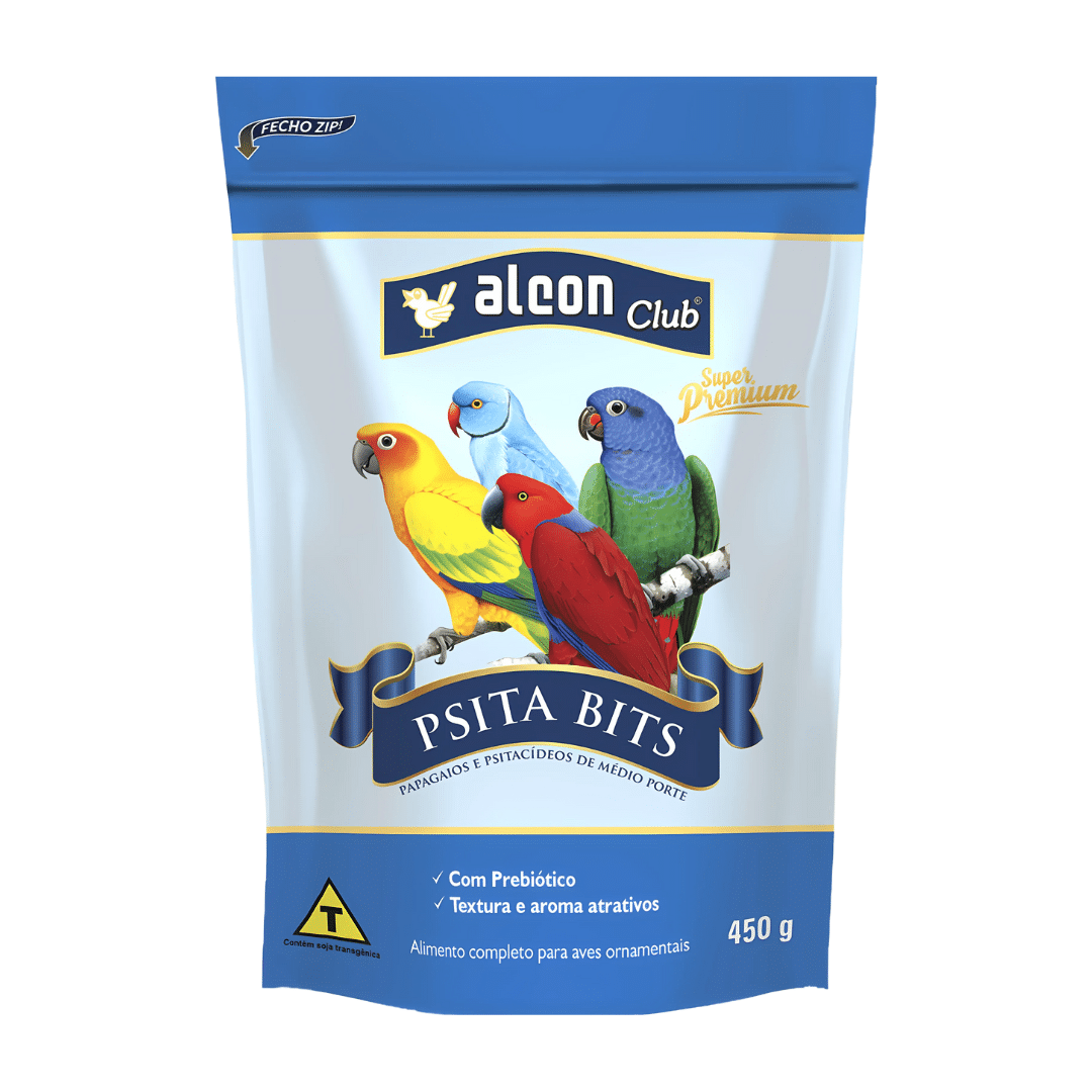 Alcon Club Psita Bits Super Premium é um alimento extrusado completo especialmente desenvolvido para Papagaios e Psitacídeos de médio porte como Jandaias, Maritacas, Ring Necks e Eclectus. O formato foi elaborado especialmente para estimular a manipulação pelas aves, reproduzindo a situação encontrada na natureza. Sua formulação especial contém vitaminas, minerais e Prebiótico, que promove o crescimento seletivo de bactérias benéficas presentes nos intestinos, melhorando o aproveitamento dos nutrientes. Adequadamente balanceado e rico em nutrientes, apresenta textura e aroma atrativos, que estimulam a aceitação e promovem melhor aproveitamento do alimento pelas aves. Contribui com a higiene e facilita o manejo, pois não há necessidade da rotina diária de limpeza dos comedouros, como ocorre com sementes e alimentos frescos. Sendo assim, o alimento pode ser fornecido para vários dias. Nos períodos de reprodução e muda de penas, acrescente à dieta Alcon Club Farinhada 24-PB Super Premium ou Alcon Club Farinhada Psitacídeos Super Premium. Conheça também a linha de suplementos Labcon Club.