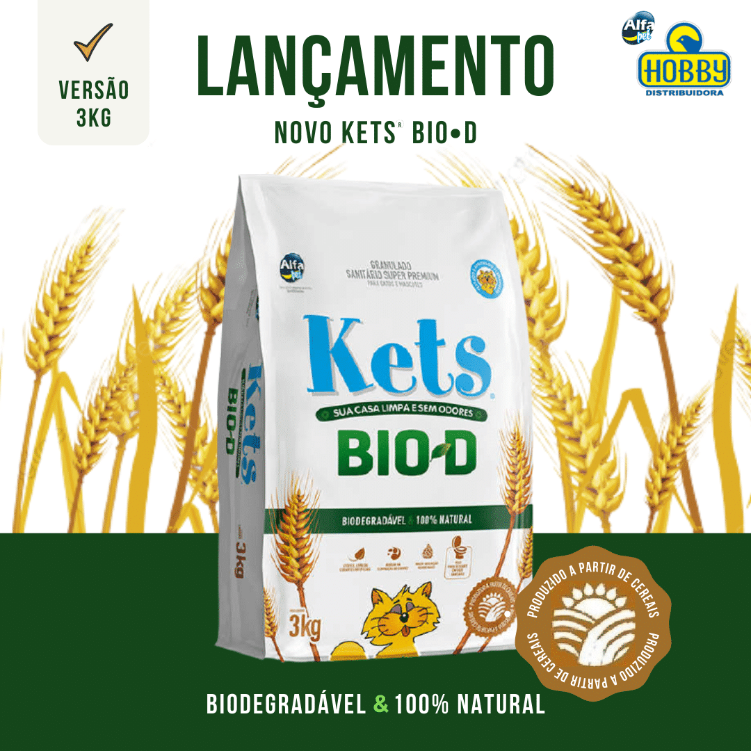 Produto feito à base de cereais, a Areia Para Gatos Kets Bio-D Biodegradável 3 Kgs é um granulado Super Premium 100% Natural, biodegradável, livre de toxinas e de componentes artificiais, podendo descartá-la em qualquer vaso sanitário tranquilamente: ou seja, ela facilita muito a limpeza desses cantinhos e da caixinha de areia.